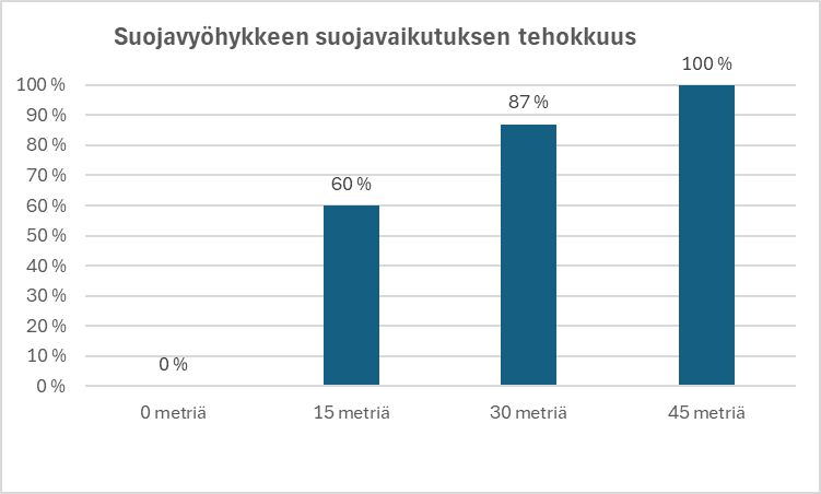 Kuva 1: suojavyöhykkeen suojavaikutuksen tehokkuus viiteen osamittariin perustuen. (1) järeät kuolleet puut vesistöön, (2) varjostus ja veden lämpötila, (3) kiintoaineksen pidättäminen, sekä (4) vesielöiden ja (5) rantavyöhykkeen varpuslintojen eliyhteisöjen säilyttäminen (LeDoux & Wilkerson 2007).